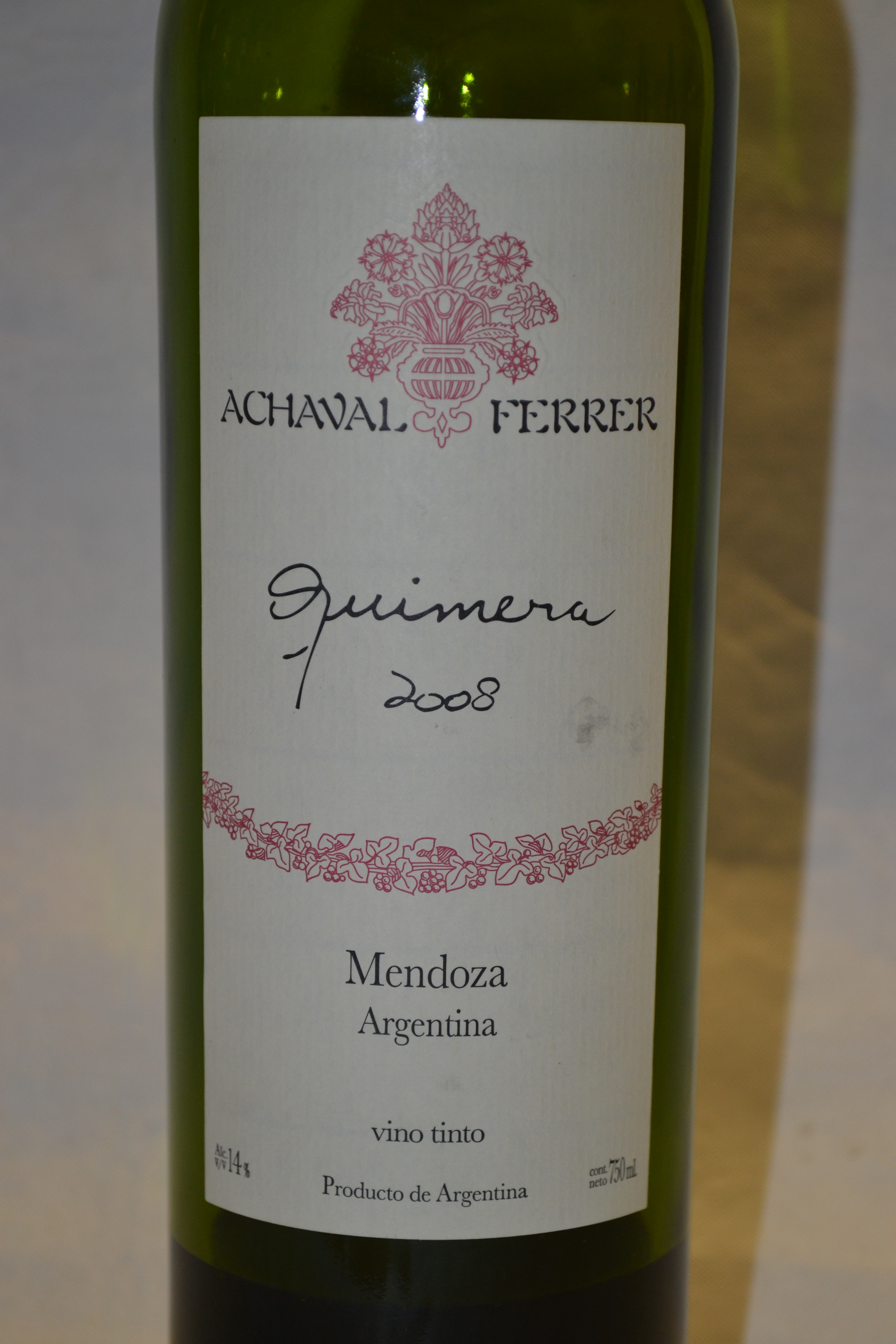 Argentinië, Quimera, Achaval-Ferrer, 2008 40% old vine Malbec Medrano & Luján de Cuyo, 22% Merlot Tupungato, 20% old vine Cabernet Sauvignon Medrano & Tupungato, 16 maanden barriques, 14% Cabernet Franc Tupungato en 4% Petit Verdot Malbec primeert in geur en smaak, veel tonen van rijp donker fruit; pruimen ook bramen naast cacao, tabak en vanille van stevig houtgebruik, geconcentreerd fruit met duidelijke zoete accenten, toegankelijk en bijna gemakkelijk, presenteert zich al prima drinkbaar volledig op dronk, fruit neemt af bij lang open staan,